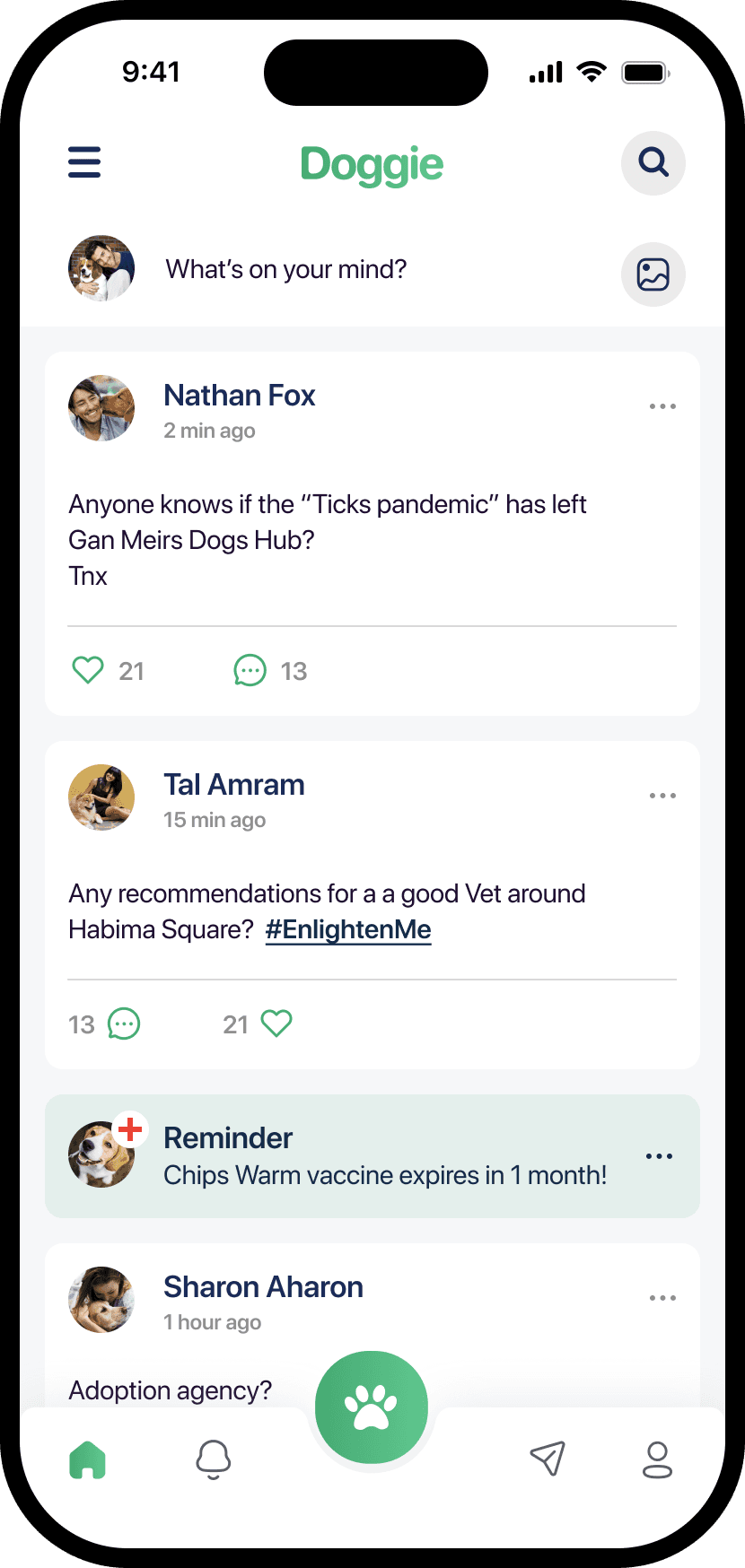 This is a social feed where users can share posts, photos, and questions, creating a community feel similar to a Facebook group but specifically for dog owners. It’s a space to connect and engage with other pet lovers in the app.
